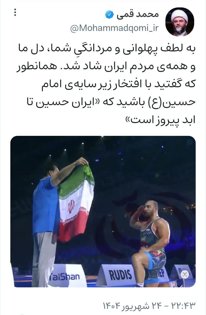 به لطف پهلوانی و مردانگیِ شما، دل ما و همه‌ی مردم ایران شاد شد. همانطور که گفتید با افتخار زیر سایه‌ی امام حسین (ع) باشید که «ایران حسین تا ابد پیروز است.»