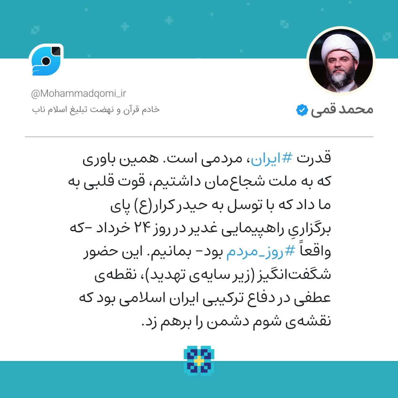 به گزارش روابط عمومی سازمان تبلیغات اسلامی، حجت‌الاسلام محمد قمی، رئیس سازمان تبلیغات اسلامی در صفحه شخصی خود در شبکه اجتماعی ویراستی بعد از سخنرانی تلویزیونی شب‌ گذشته‌ی رهبر معظم انقلاب خطاب به ملت ایران که در جریان آن، با اشاره به حضور چشم‌گیر و تاریخی مردم در خیابان‌های شهرهای سراسر کشور در روزهای ۲۳ و ۲۴ خرداد (بعد از نماز جمعه و در اجتماع غدیرِ روز شنبه) اشاره کردند نوشت؛