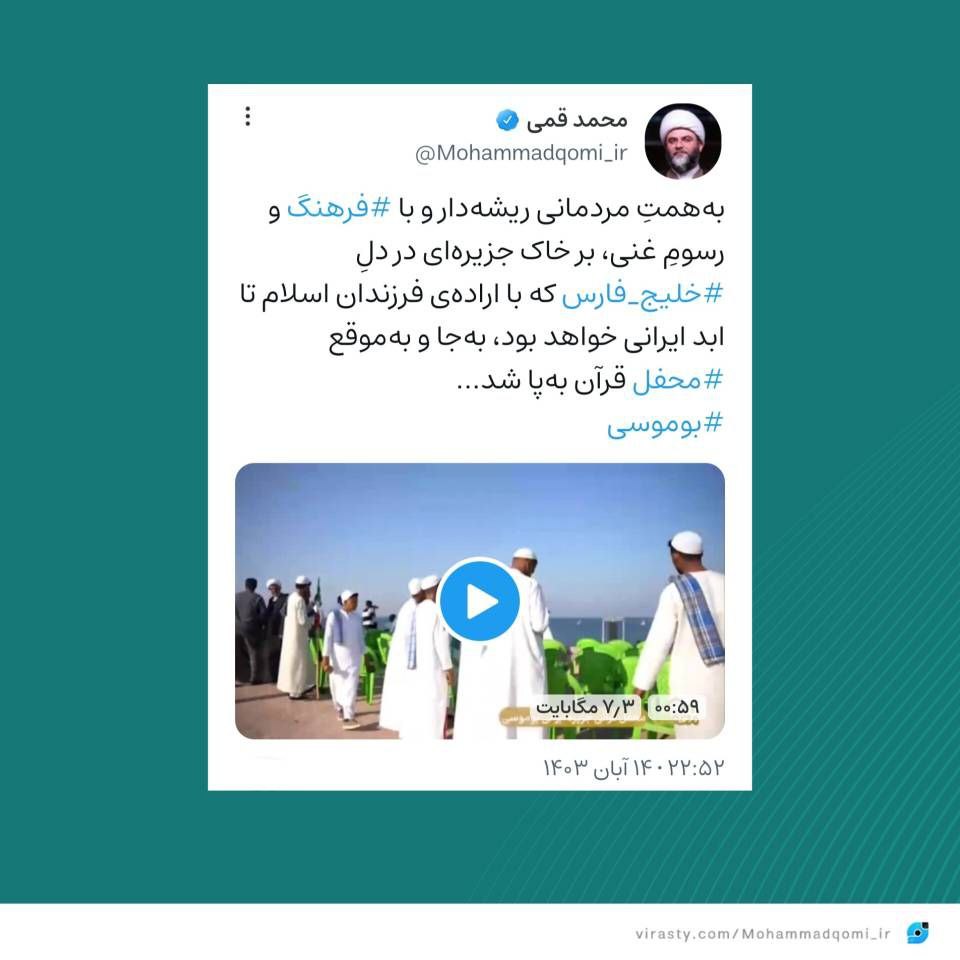 به گزارش روابط عمومی سازمان تبلیغات اسلامی، حجت الاسلام قمی، رئیس سازمان تبلیغات اسلامی در واکنش به برگزاری برنامه محفل در جزیره بوموسی در شبکه اجتماعی ویراستی نوشت: