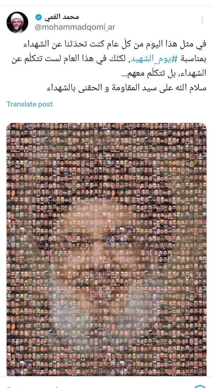 گفتنی است ترجمهی فارسی این توییت (در شبکهی اجتماعی ایکس) به شرح است: هر سال در چنین روزی، تو برایمان به مناسبت روز شهید از شهدا سخن میگفتی. اما امسال دیگر از شهدا سخن نمیگویی، بلکه با آنان سخن میگویی... سلام خدا بر سید مقاومت و خدایا مرا نیز به شهدا ملحق کن.