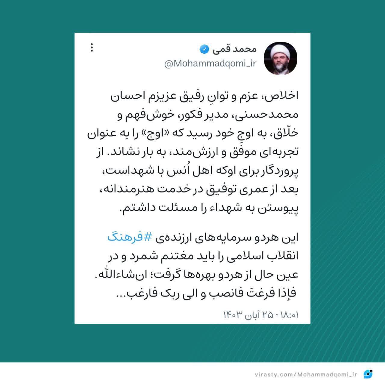 به گزارش روابط عمومی سازمان تبلیغات اسلامی، حجتالاسلام قمی، رییس سازمان تبلیغات اسلامی با انتشار متنی در شبکه ویراستی از دستاوردهای احسان محمدحسنی در سازمان هنری رسانهای اوج قدیر و تشکر کرد.