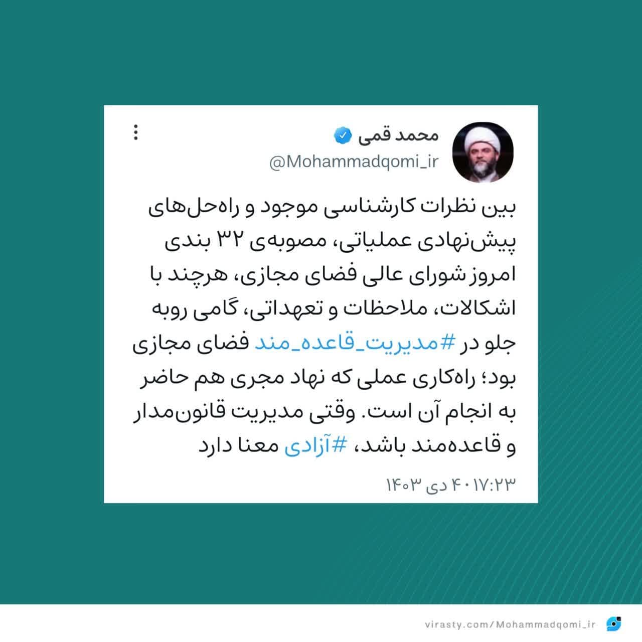 حجتالاسلام قمی در پاسخ نوشت، گفتگوها و آراء شورای عالی قانونا محرمانه است، اما همانطور که پیشتر در حرم مطهر رضوی و محضر مردم عرض کردم، باید برای قاعدهمندی فضای مجازی برنامه قابل اجرا داشت.در این 32 بند، هرچه دیر و حداقلی، تعهدات صریحی برای حمایت از خانواده و سکوهای ایرانی مطرح است که سران قوا و مجریان به آن متعهدند.