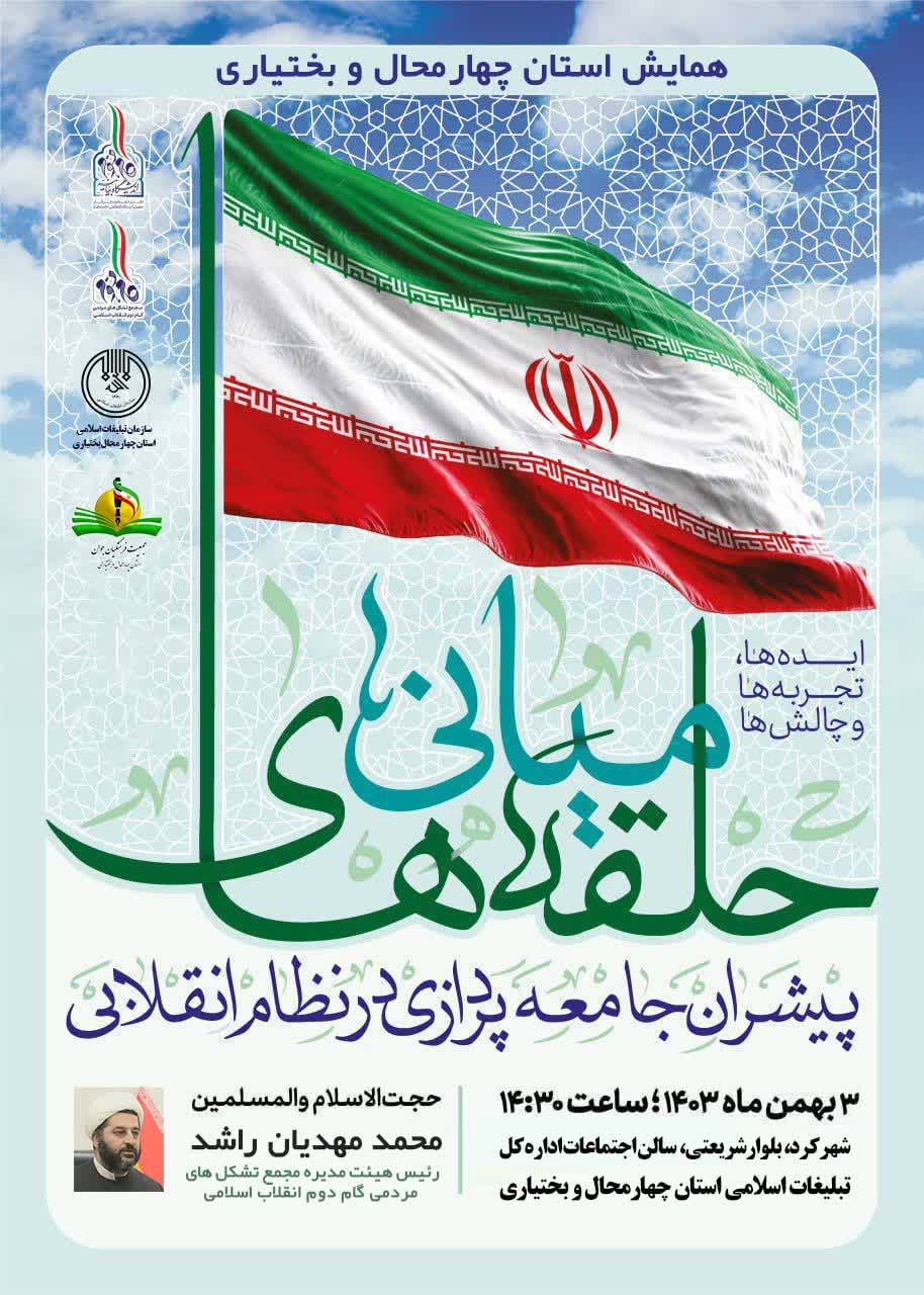 همایش «حلقههای میانی، پیشران جامعه پردازی در نظام انقلابی» امروز سوم بهمنماه در سالن بلاغ ادارهکل تبلیغات اسلامی چهارمحال و بختیاری برگزار میشود.